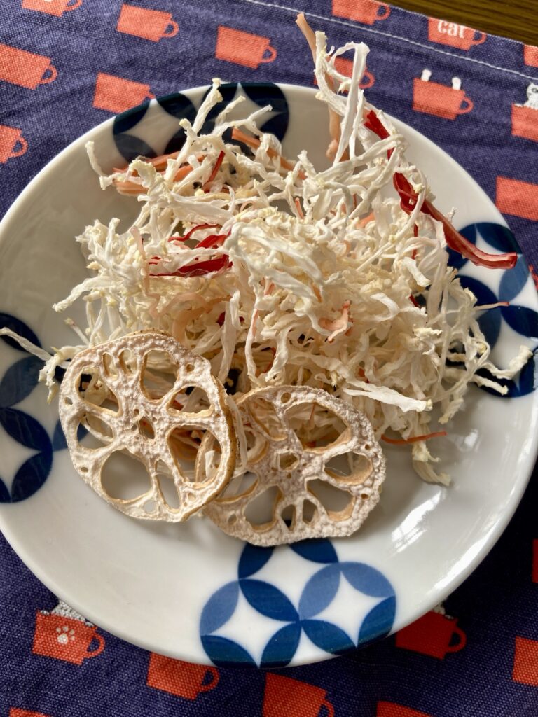 大根カニカマ 大根の千切りとカニカマほぐしたやつを乾燥させたもの。ほぼほぼさきいか。出来立てはぱりぱりだけれど、翌日は湿気を吸ってよりさきいかに近い口当たりに。さきいかと比べると相当安い。